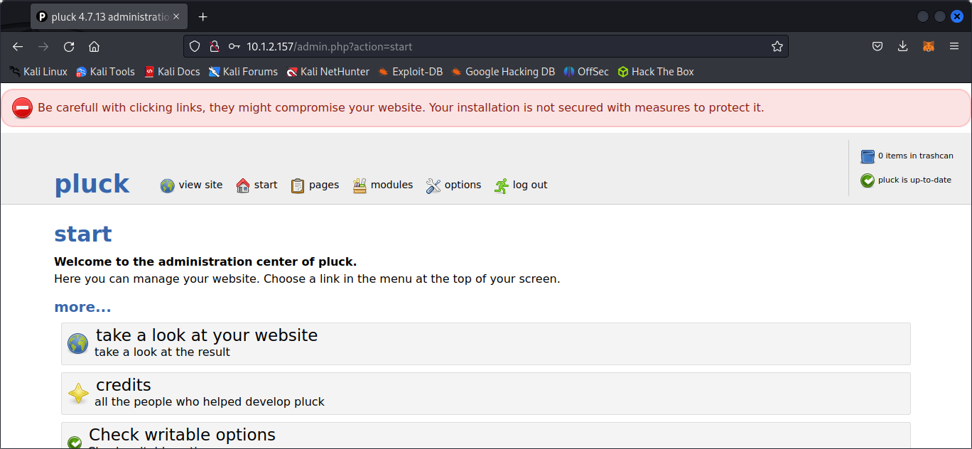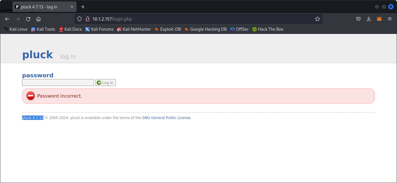 I noticed the website using pluck-cms 4.7.13 and there is login.php page http://10.1.2.157/login.php. I quickly search on google for default creds and use it but it’s incorrect, and also need to wait for few minutes after entering wrong password for 5 times.